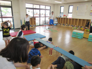 今回の「らいこうじアドベンチャー」は親子体操あそび会でした。3才未満児のお友達は自分から体操の先生の真似をしたり、お母さんやお父さんと一緒にトンネルをくぐったりして楽しみました。サーキットでは、お山に登り、滑り台をすべって、鉄棒にぶら下がる「おさるさん」になる等、たくさんの「大冒険」を親子で楽しみました。