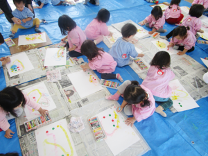 今日は1才児のサクラクレパス教室でした。子ども達は長い画用紙にシールを貼ったり、マーカーでお絵かきをしたりして「世界に一つだけの巻物」を作りました。できあがると保育者に見せて、たくさん子ども達が作品についてのお話を聞かせてくれました。「作品を作るだけでなく、作った作品の説明をする」ことによって、子ども達の言語能力も高まっていきます。作品をお父さん、お母さんに見せると嬉しそうな子ども達でした。