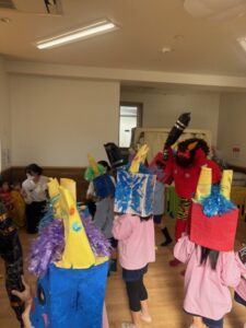 今日は節分の行事を楽しみました。子ども達は豆に見立てた大きな玉を鬼に目掛けて思いっきり投げながら、元気な声で「鬼はそと、福はうち」と叫んでいましたよ!